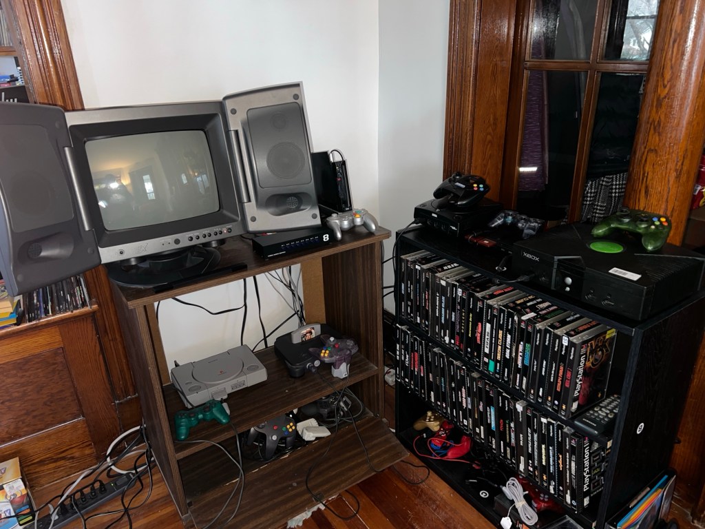 The first step was to set up my gaming space. That meant taking down the systems I was no longer using and resetting the space with the ones I am using: original PlayStation, Nintendo 64, Dreamcast, PlayStation 2, original Xbox, and Wii (which doubles as my Gamecube player). That’s still plenty of consoles to enjoy, and my collection still has thousands of games to play.