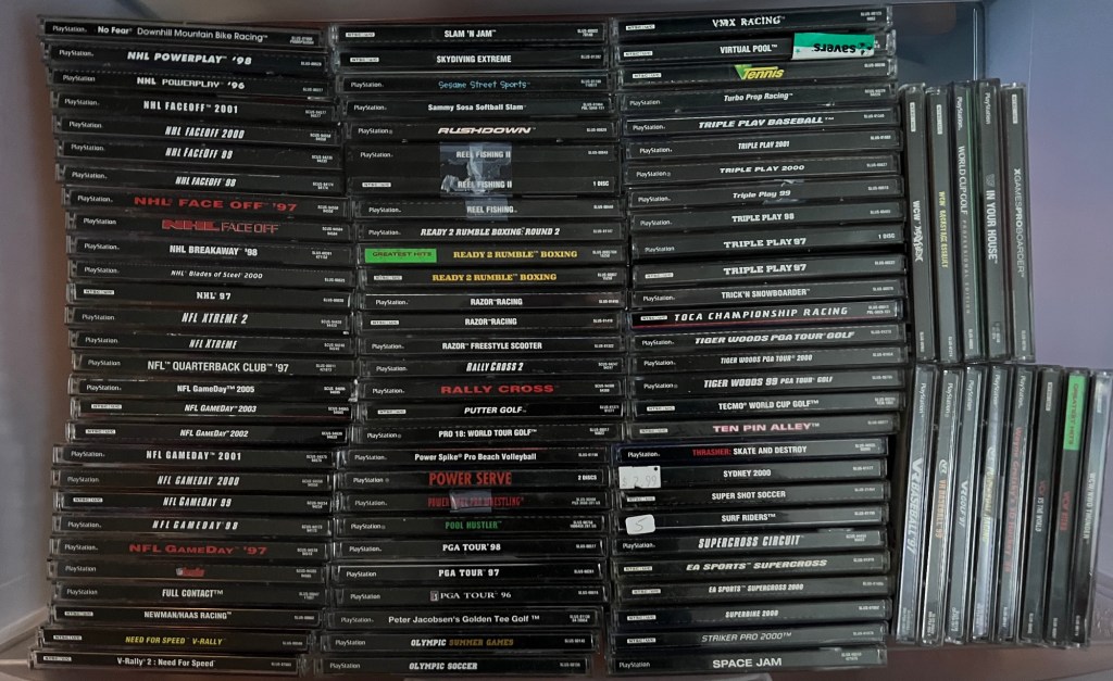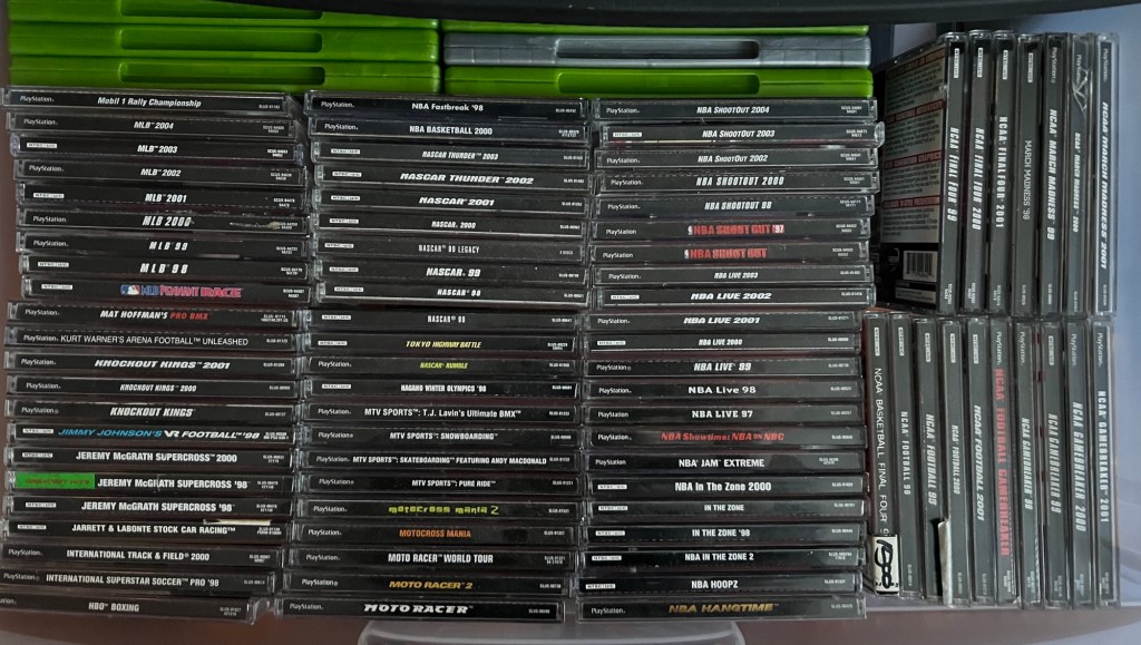 Not all of my sports games are in these drawers, however. I have a “Favorites” rack in my living room, housed at the top of a bookshelf that holds my Gamecube, Xbox, and Wii games. This rack has a bit of almost everything… sports, arcade games, action, adventure, fighting games, and more. In addition, some sports games come in original longbox cases, which are from the first year of the original PlayStation’s lifespan– when we could just call it “PlayStation” without being number-specific.
