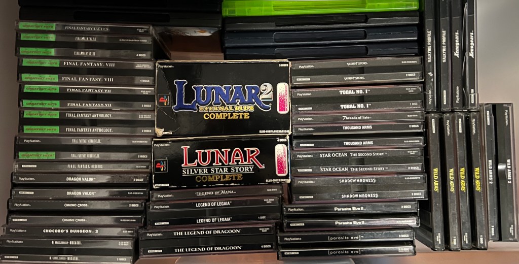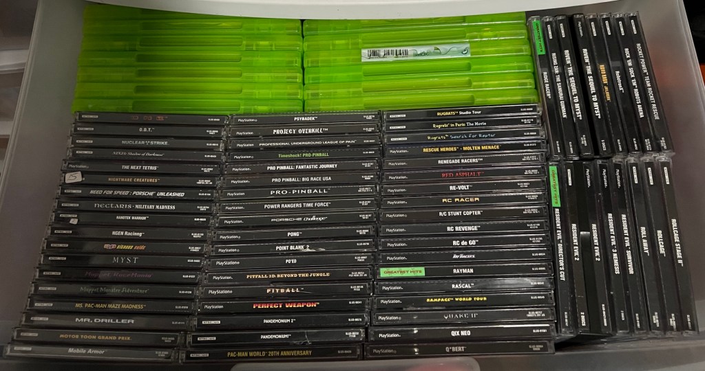 Not pictured are two small tubs of discs. One has all of my “loose” discs, which are just the discs and no manuals or cases. I got many of these from GameStop during the mid and late 2010s. Mega Man Legends and its sequel, Einhander, Castlevania Chronicles, Rival Schools, and both Bloody Roar games are “loose” in my collection. The other tub has demo discs in it, ranging from the earliest demos (like the Developer CD that was a console preorder bonus and the first two PlayStation Picks demos) to demos given by retailers or restaurants (like Toys ‘R Us and Pizza Hut) to JamPacks to demo discs included with the Official U.S. PlayStation Magazine.