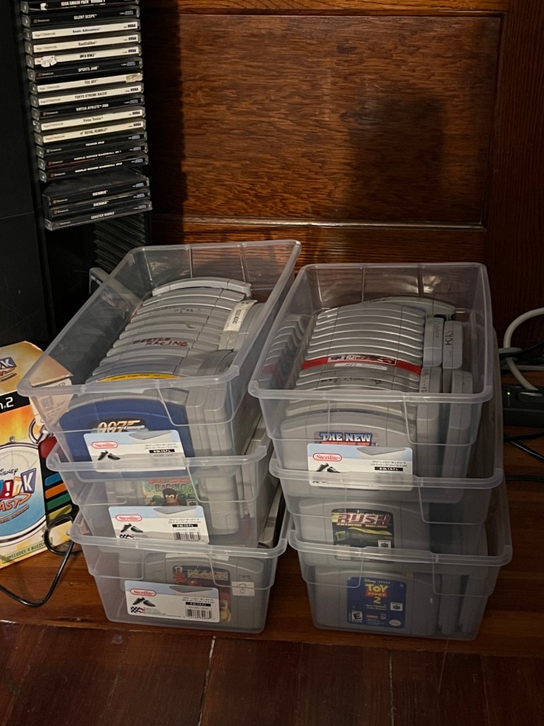 I’ve finally started adding more Nintendo 64 games, after a bit of a delay in doing so. One of the reasons I’d held off was that my N64 games were disorganized in a cabinet… so I picked up some six-quart small plastic bins to put the games in, and six of them were able to house the 110 games that I own. I still have four bins left, so I have space (and motivation) to buy some more games. In fact, I have plans this week to visit a couple of video game stores to see what I can find from my wish list.